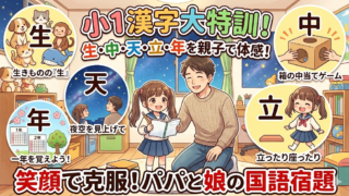 小1ドリル 【小1漢字】娘とパパのドタバタ国語宿題奮闘記!〜「生・中・天・立・年」を体で覚える夜〜