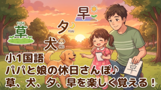 小1ドリル 【小1国語】パパと娘の休日さんぽ♪ 日常の風景から「草・犬・夕・早」の漢字を見つけよう!