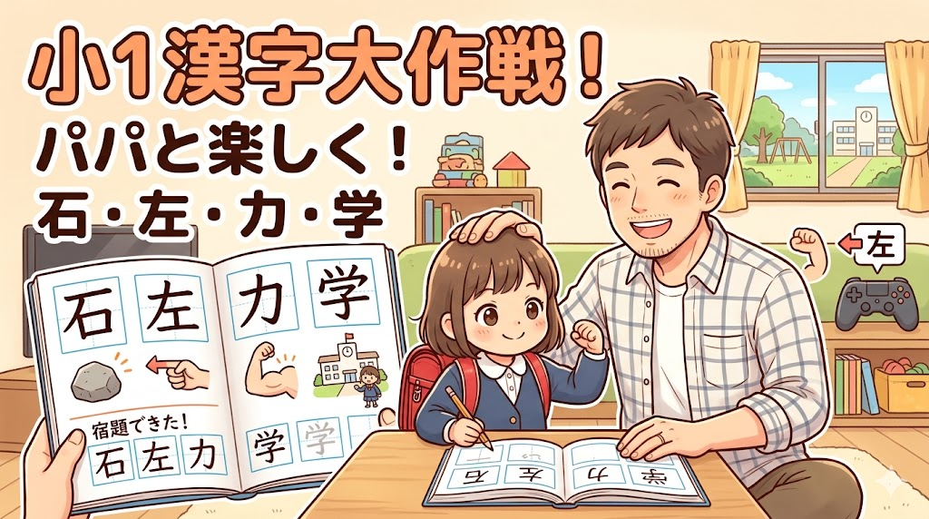 娘が小学校に入学してから、毎日少しずつ大きくなっていく背中を頼もしく見つめています。ある日の漢字の宿題です。「漢字っていっぱいあって難しいな…」と、ドリルを前に少し不安そうな顔をしている娘。でも、せっかくなら「漢字って面白い!もっと知りたい!」と思ってほしいものです。だからこそ、ここはパパの出番です。今日の宿題は「石」「左」「力」「学」の4文字。よし、パパと一緒に、漢字の世界を探検してみましょう!まずは一緒に、漢字の成り立ちと書き順をゆっくり確認していくことにしました。