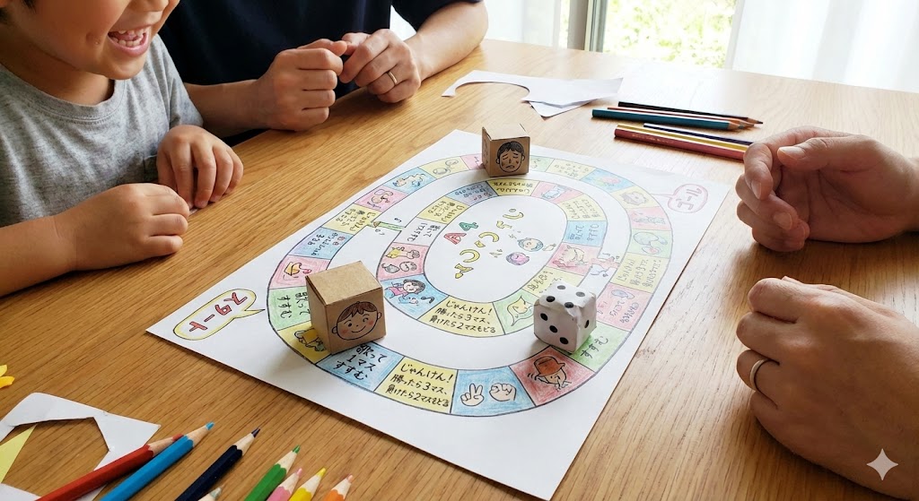「あーん、戻りたくないよ〜!」と悶絶する娘。 そんな一喜一憂も、手作りだからこそ、ルールをその場で微調整(「特別に1回だけやり直しね!」など)できる「優しさ」を含んで進行していきました。