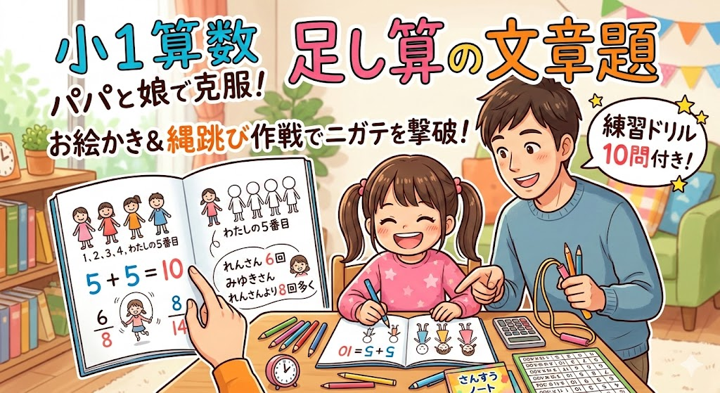 【小1算数】算数の文章題(足し算)が解けない!?娘とパパの「お絵かき&縄跳び」大作戦